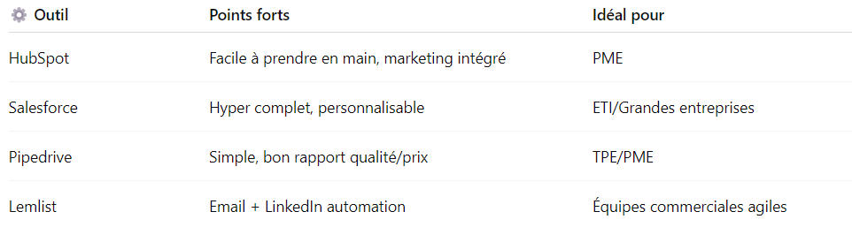Un CRM (HubSpot, Salesforce, Pipedrive), des outils d’automatisation (Lemlist, Apollo) et un dashboard de suivi (Data Studio) sont indispensables pour exécuter un plan efficace.
